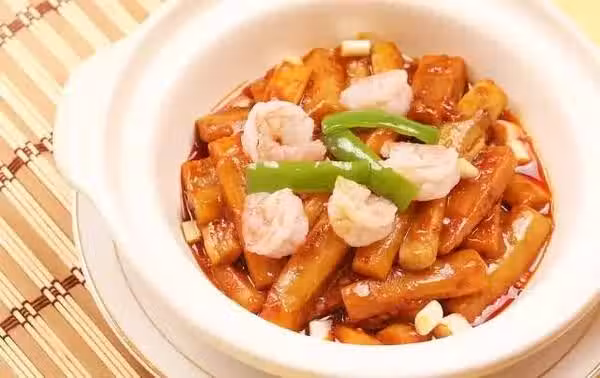 9、放入蝦球和茄子,中火燒三分鐘,中間稍微翻動一下,然後汁差不多快沒了,勾芡出鍋。