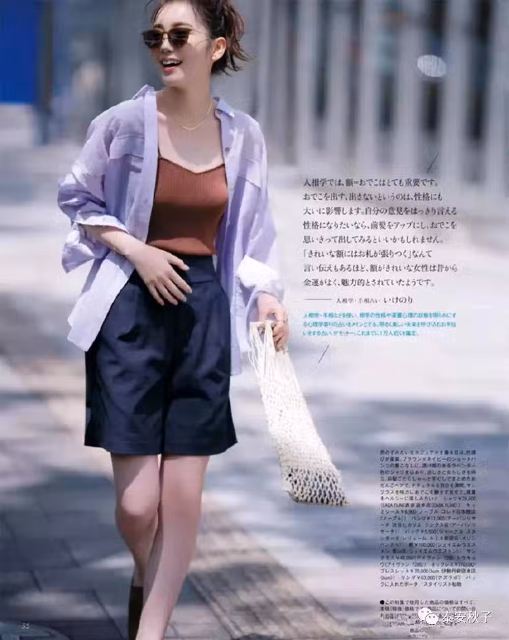美女將一件淡紫色輕薄襯衫當作夏季防曬衫,直接疊穿在焦糖色弔帶衫的外面,下身配條藏青色高腰短褲,配上酷酷的同色墨鏡,不會單調,卻保持了優雅時髦感!