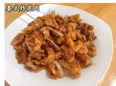 材料:三層肉(去皮切薄片)300克,鹽半茶匙,胡椒粉半茶匙,【醃製1小時】 配料:大蔥(切絲)半粒,薯粉適量 醬料:泰式甜雞醬2湯匙,泰式甜辣醬2湯匙,酸梅醬1湯匙,鹽¼茶匙,水2湯匙(放入碗裏攪拌均勻) 做法: 1.熱油鍋,肉片沾上薯粉放入炸至略微變黃撈起。2.等油熱,再放入炸至金黃色撈起瀝幹油。3.洗凈鍋,熱1湯匙油,炒香大蔥。4.倒入醬料,煮滾,放入肉片快速炒均勻即可。