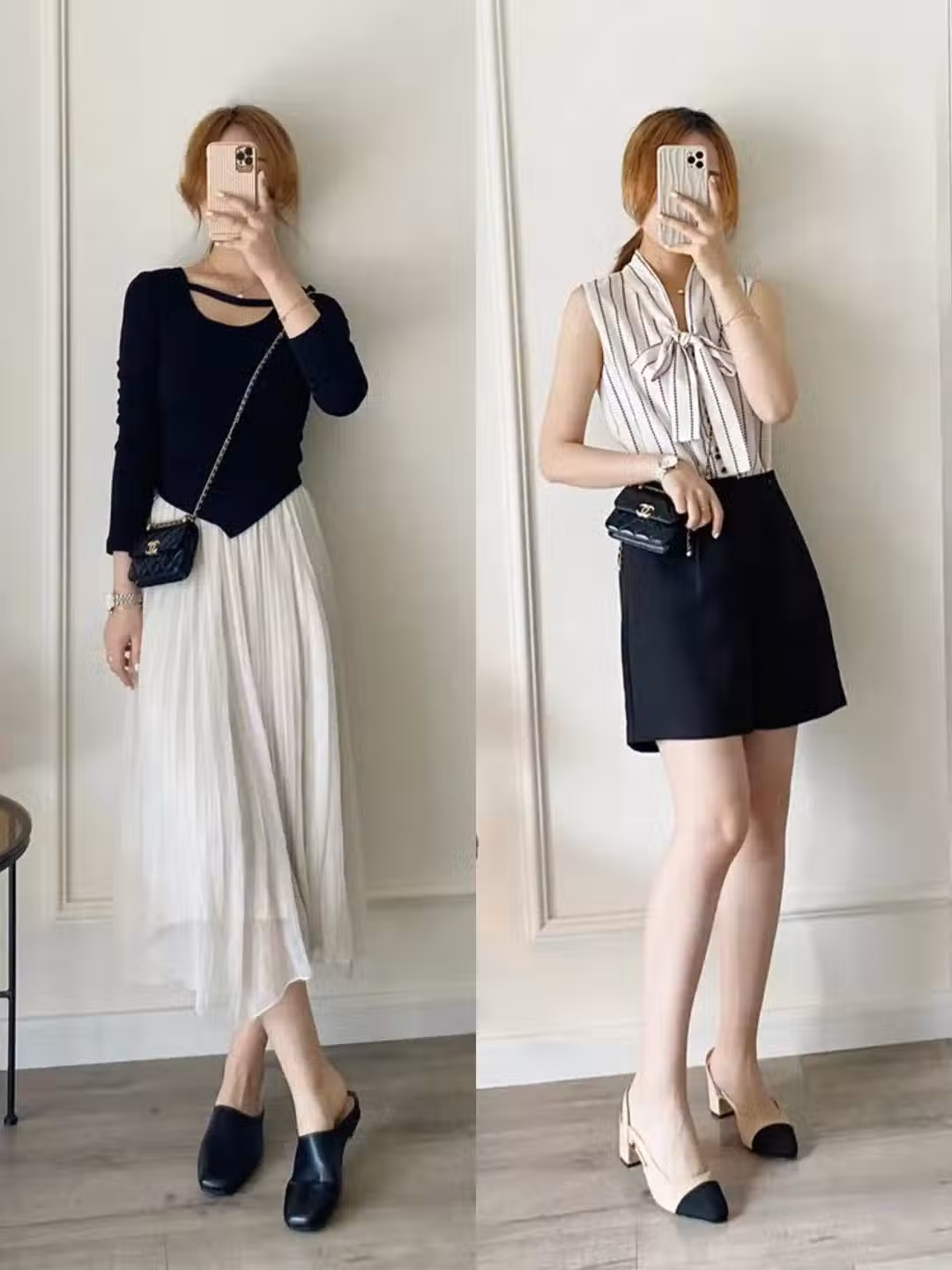 喜歡半裙的姐妹也有一套固定的選色模板,不同長度的半裙配色方式不同,如果是不過膝短裙,黑白色上身效果最好,如果是左邊這類網紗及踝裙,白色、淺灰色上身效果最耐看。