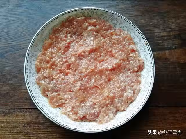 4.將攪好的肉餡放在稍深一些的盤子內,用湯匙抹平成圓形,鋪滿盤底就可以了