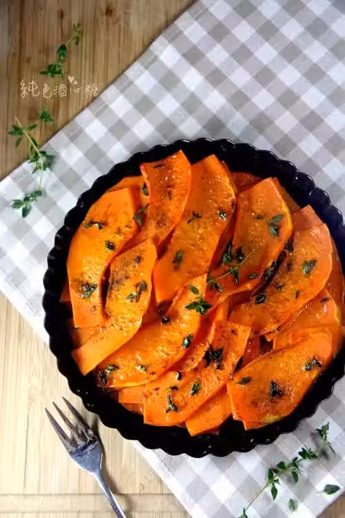 南瓜300克,百里香一小把,橄欖油10克,鹽適量,黑胡椒粉適量