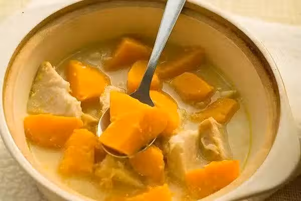 南瓜200克,芋頭200克,椰汁270ml,鹽適量,植物油,薑片,素高湯