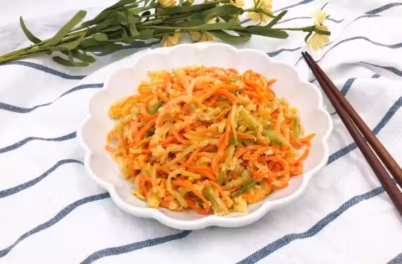紅蘿蔔一根,白蘿蔔一小節,鹽少許,澱粉兩勺,麵粉兩勺,食用油少許,辣椒油少許,香醋少許