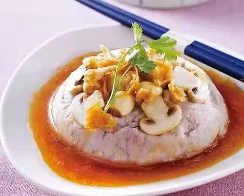 4.將作法1的芋泥、作法3的蓮子碎、冬菜和調味料A混合 拌勻,盛入作法3放有蘑菇片的碗中壓緊,放入水已煮滾的蒸籠內,以小火蒸約10分鐘後倒扣在盤中,淋上混合拌勻的調味料B,放上香菜即可。