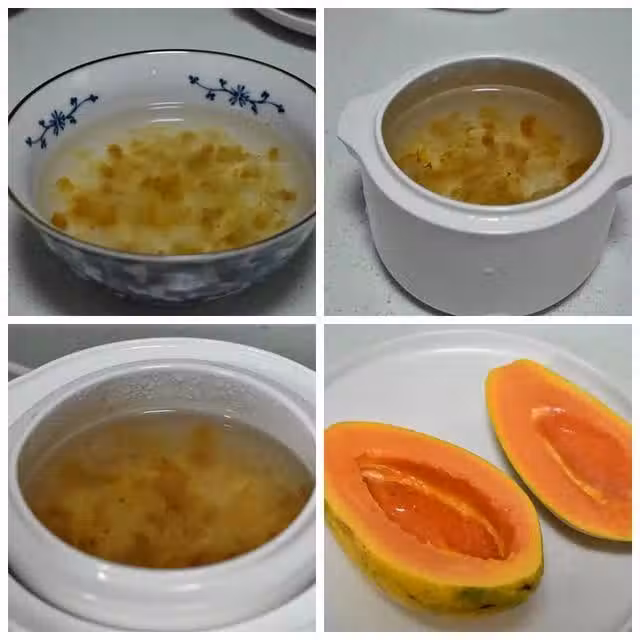 4把木瓜切半,可以用木瓜盛著湯羹,還可以把木瓜切小塊,木瓜塊和湯羹一起,當然如果木瓜的甜味,可以把木瓜塊和桃膠、皂角米、雪燕一起燉湯。