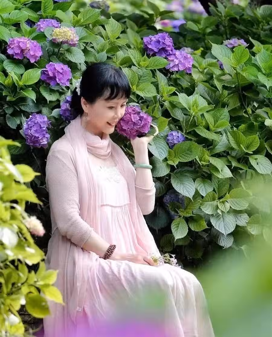 比如下圖穿著素色裙裝的模特,坐在繡球花海中,有朦朧的色塊作為前景,模特一手拿著花球,低頭微微笑,一張好看的花中人像。很多時候中年女性朋友們拍人像,安靜的狀態,比飛揚的狀態更優雅更耐看。