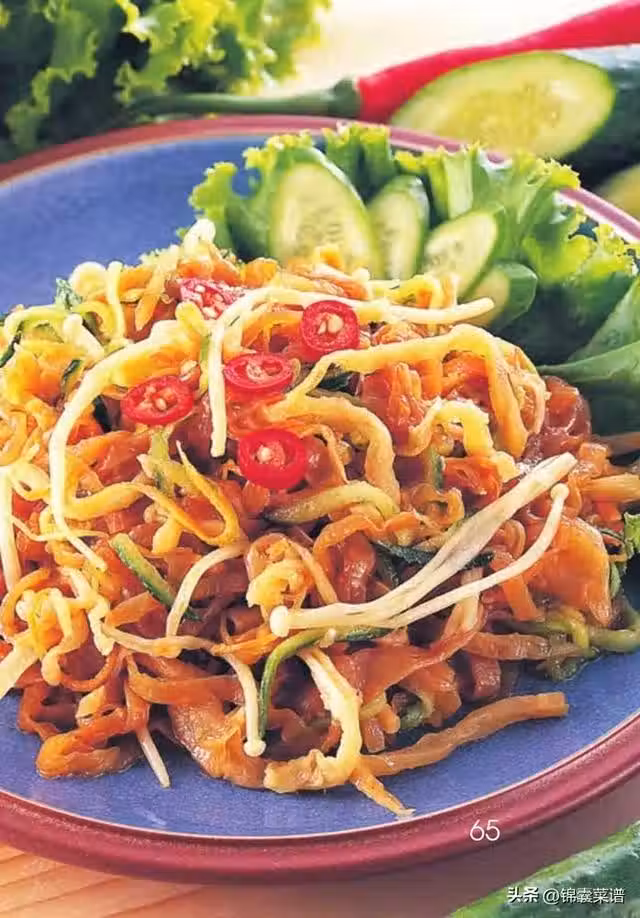 海蜇頭 150 克,青辣椒、黃瓜各 100 克,紅辣椒少許