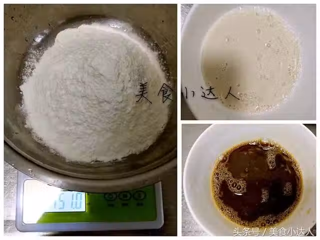 2.將紅糖水和酵母水都倒入麵粉中,用打蛋器攪拌至無明顯顆粒;