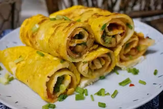 6. 待蛋液基本凝固後,翻面。抹上豆瓣醬,撒上蔥花香菜。折好出鍋。