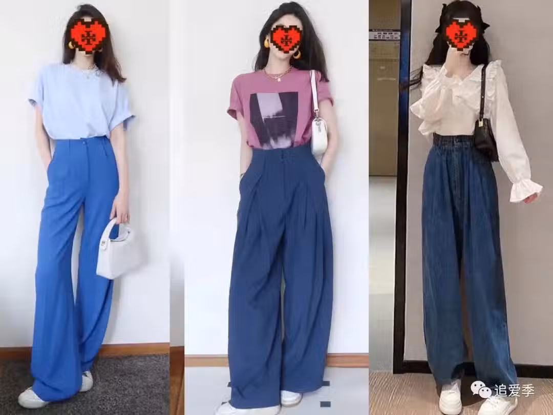 這組高腰闊腿褲深藍色+淺藍色的組合,真的太洋氣吸睛了,大夏天的,就是要選擇藍色或者白色的單品來穿,基礎款的淺藍色T恤,在這種低飽和度的藍色襯托下,就算是黃黑皮的女性,也可以輕鬆駕馭。 配色4:黑+藍色