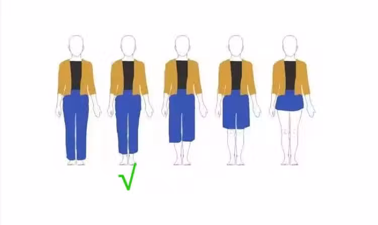 觀察上圖我們可以發現,當人物露出腳踝部位的時候,腿部顯得最細。因為這樣可以將有贅肉的大腿和小腿部位擋住,而腳踝時人體最細的部位之一,露出腳踝可以令人產生腿細的錯覺,而且還會給人一種褲子不夠穿,腿很長的錯覺,這樣就會顯得腿部又細又長,拉長了整體線條。
