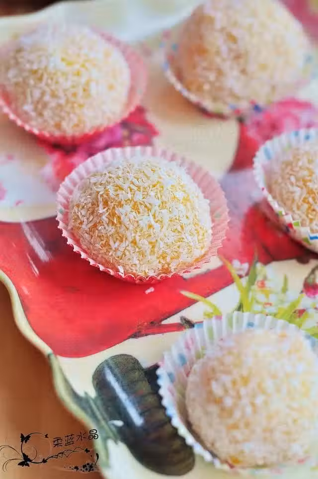 4.水果表面有水分,放在糯米皮上容易打滑,裹一層椰蓉就好包了。
