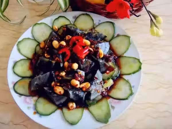 用料:黃瓜1根,松花蛋3個,蒜5瓣,生抽1/2湯匙,食鹽1茶匙,陳醋1湯匙,白糖1/2茶匙,芝麻油1茶匙,雞粉1/2茶匙,辣椒油1湯 做法:1、黃瓜洗凈用鹽水浸泡15分鐘,黃瓜用刀背拍碎塊,皮蛋切瓣,蒜頭剁碎末