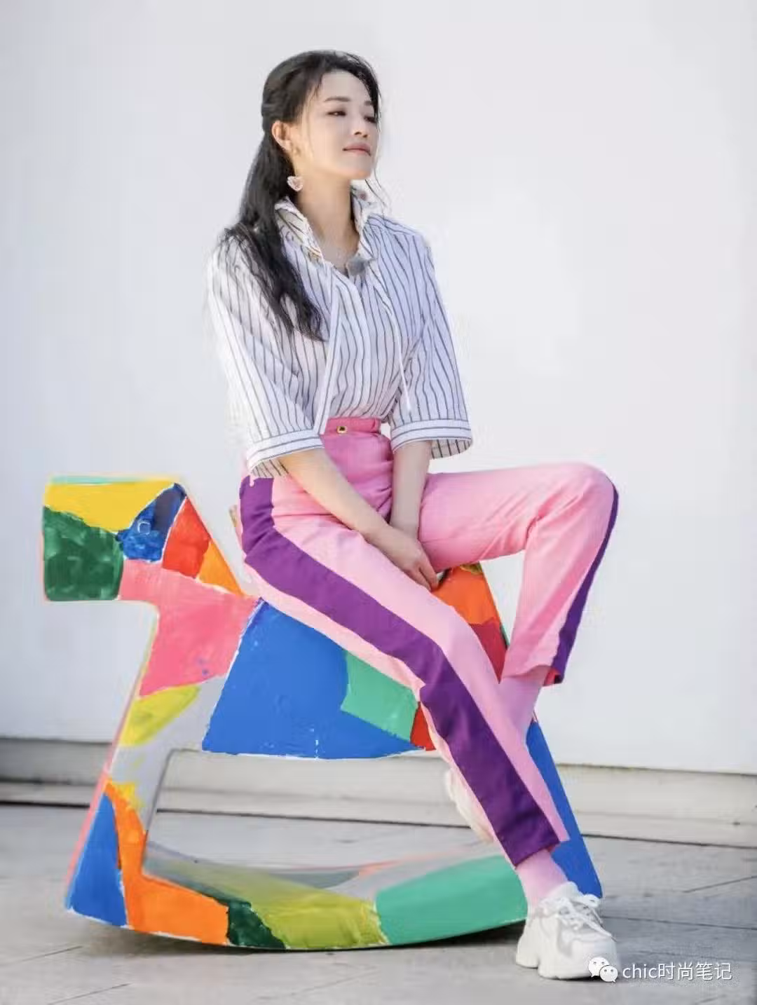最近超火的「多巴胺」風穿搭老早被舒淇搭配過了,白色條紋襯衫搭配粉色拼接得休閒褲,顏色亮眼而不會過分浮誇,搭配一雙小白鞋,讓人把視覺重心落於褲子上,個性十足。