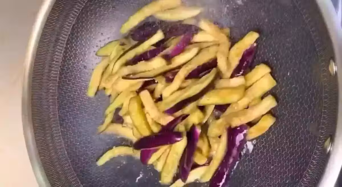 將適量食用油倒入鍋中。油熱後,倒入加工過的茄子。油炸後,取出放在盤子裡備用,然後使用多餘的底油。然後,打開小火,將肉末煎至香味變淡。油炸法可以最大限度地減少吸入過多的油,從而避免過多的油膩感。