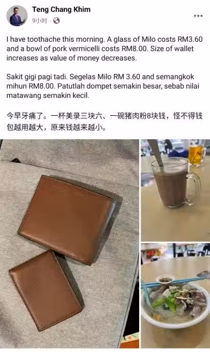 根據鄧章欽的貼文,他今早的早餐是一杯美祿及一碗豬肉粉,其中美祿的價格為3令吉60仙,而豬肉粉的價格為8令吉。他對飲料及食物的售價漲幅他感到錯愕,也不忘幽默的說,「怪不得錢包越用越大,原來是錢越來越小。」