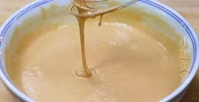 紅糖水全部加完,順著一個方向攪拌,讓麵粉起筋,這樣口感去掉更加的勁道。攪拌五分鐘左右,麵糊是像這樣細膩無顆粒,特別粘稠,提起來是呈直線留下的狀態就可以了,蓋上保鮮膜密封起來。