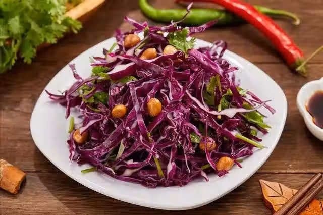 紫甘藍洗凈後切絲,香菜切段,大蒜切末,將紫甘藍、大蒜倒在盆里,將熱油澆在蒜末上,激發出香味。緊接著把鹽、雞精、白糖、生抽、醋、香油倒在裡面,香菜倒在裡面,抓拌均勻後開吃。