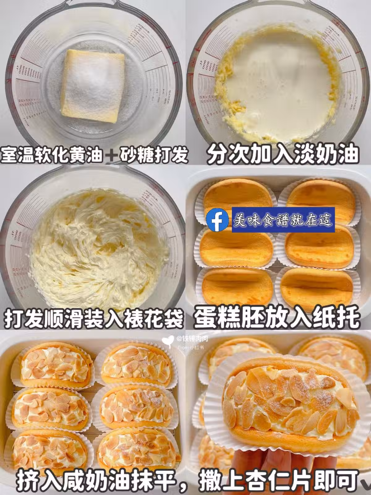 7⃣️蛋糕胚放入之託,擠入咸奶油,表面撒上烤好的杏仁片、糖粉即可。