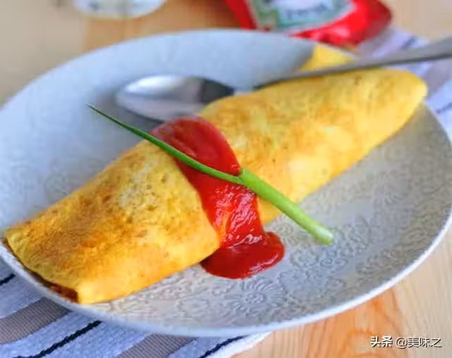 12、從兩邊向中間捲起,翻面,澆上適量番茄醬,即可。
