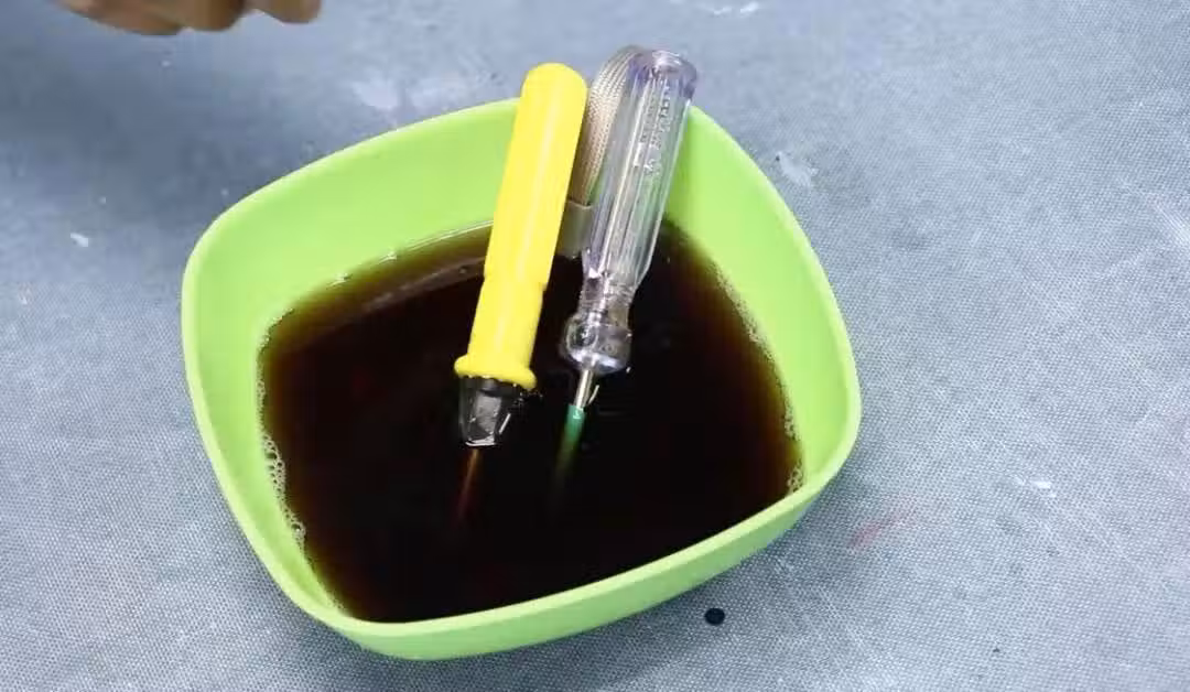 然後我們再倒入一罐可樂,攪拌均勻後,將生銹的工具放進碗中浸泡。可樂中含有一種叫檸檬酸的成分,能與小蘇打發生化學反應,強強聯合,只需20分鐘能把上面的鐵銹分解掉。