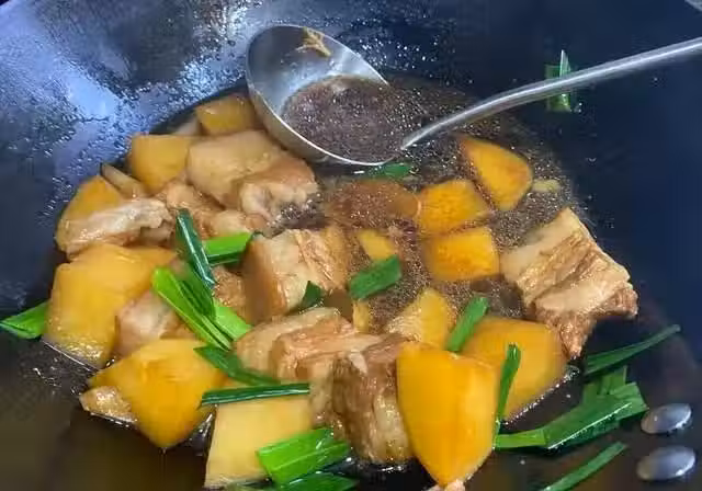 20分鐘後,再把盤菜去皮切塊,加點蒜頭下鍋一起燉,繼續煮10分鐘就可以出鍋了,出鍋前再撒些蒜葉。盤菜要保持口感,所以千萬不要和五花肉一起下鍋,不然經過10分鐘高壓燉煮,盤菜就燉爛了。