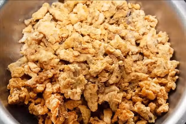 3、原本大塊的豬油,也變得越來越小、越來越干,鍋子裡的油量,也開始慢慢增加。繼續熬制一陣子,豬板油變成了豬油渣,變成金黃的顏色,焦香的狀態了,就可以盛出來啦,這個豬油渣拿來炒菜,也香得很。