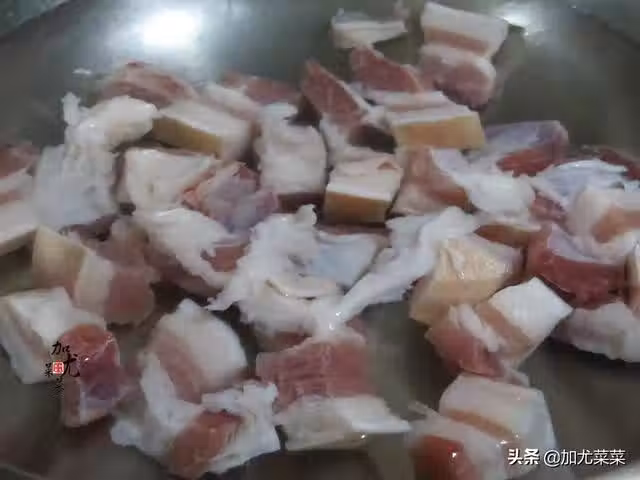1、將一條新鮮的五花肉洗乾淨,切成大小一致的小塊,放入冷中,開小火將五花肉焯水一遍,水開後再煮1分鐘再出鍋,後瀝干水分。