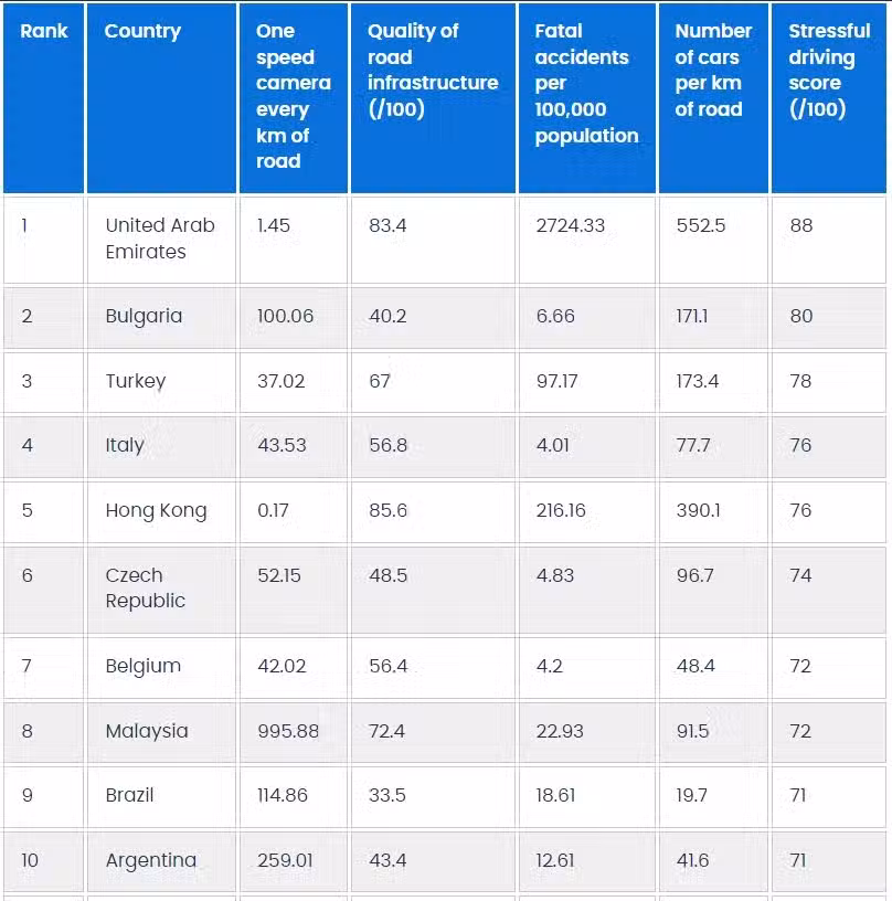 在該研究中,滿分是100分,分數越高就代表在那個國家的駕車壓力越高。