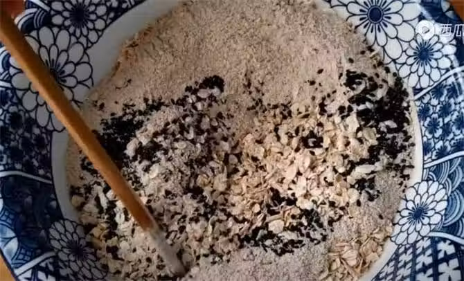 1.先在大碗裡面加入120g的即食燕麥片,然後加入20g黑芝麻,加入2g的食用鹽,再加入60g全麥粉,用筷子將它們攪拌混合均勻。