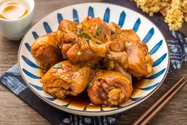2、往雞腿中,加上薑片、八角、冰糖、鹽、生抽、老抽、蚝油,充分抓勻後,倒在電飯煲中,然後加上適量的清水,蓋上蓋子燜熟,就可以出鍋了,中途不需要去看,很方便的,屬於懶人版教程。