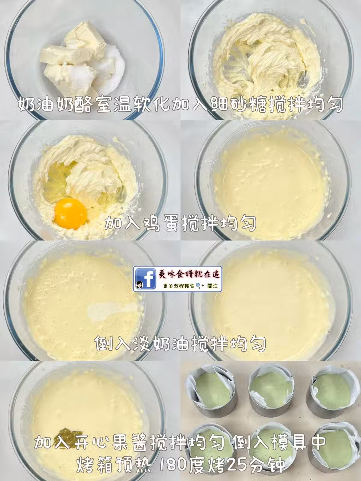 1️⃣奶油奶酪室溫軟化加糖攪拌均勻;加入雞蛋攪拌均勻,倒入淡奶油攪拌均勻,加入開心果醬攪拌均勻