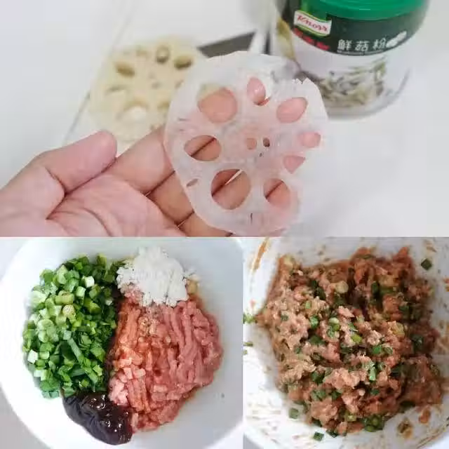 Step3. 取一片蓮藕片吸干水份,放上豬肉餡,對摺蓮藕片包好。