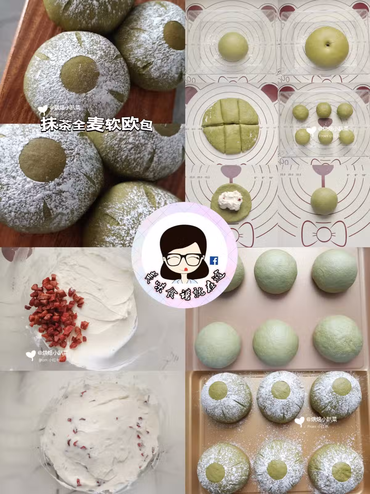 抹茶全麥軟歐包|||第一次嘗試做這款抹茶口味的全麥軟歐,麵包體是微苦的,如果不喜歡姐妹們可以多加5-8克砂糖!或者減少抹茶粉的克數!奶酪餡酸酸甜甜,真的很好吃,自己包多放點奶酪不心疼,沒有廚師機的姐妹也可以做哦