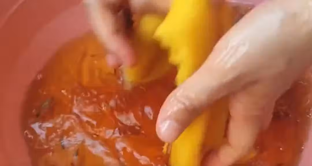 均勻之後就可以關火了,接著用漏勺把裡面的殘渣打撈出來,把湯汁倒入一個大盆中,稍稍放涼就可以用來洗手洗腳搓澡了。