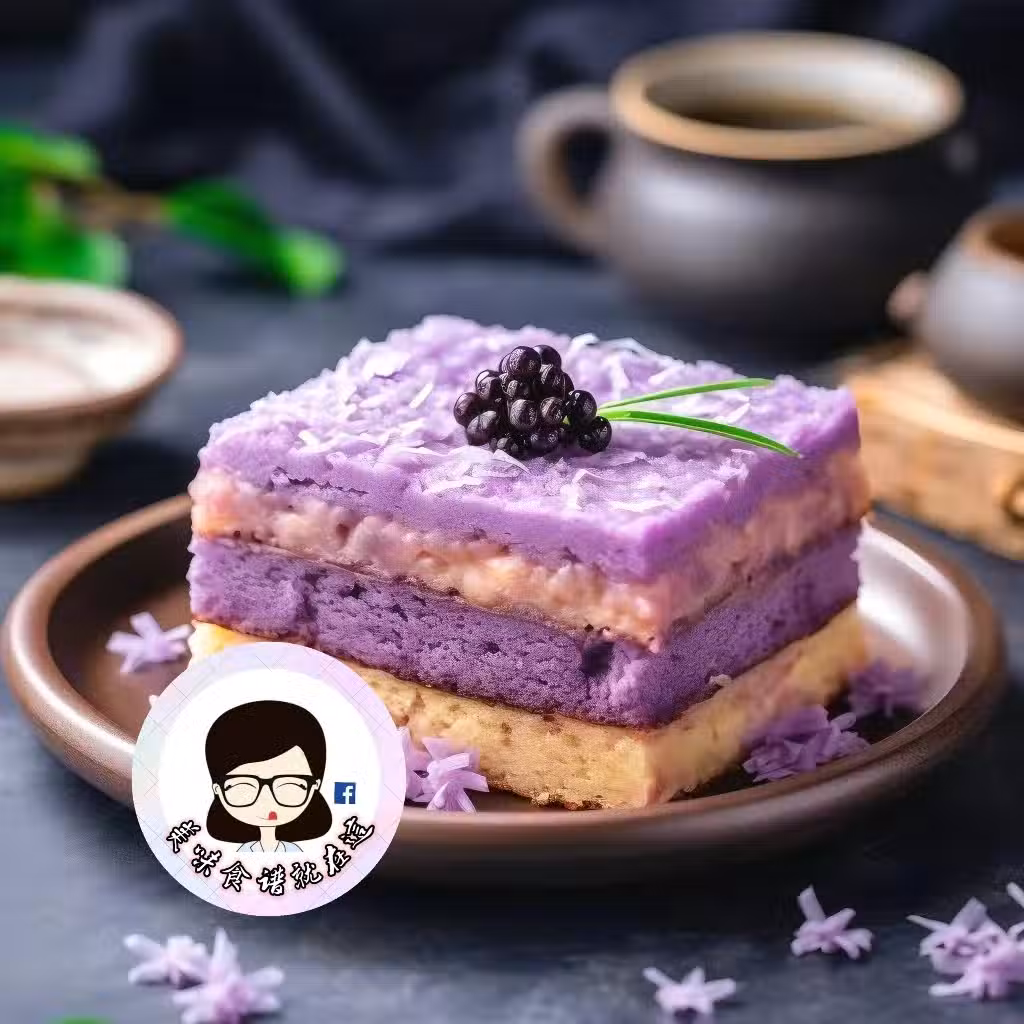 5、取一個蒸鍋,底部鋪上蒸鍋紙,倒入紫薯餡,用勺子壓平,然後倒入椰蓉糯米糊,同樣用勺子壓平。