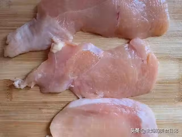 2、接著給雞脯肉來個全身按摩,用刀背輕輕敲擊雞肉,橫豎都要拍到,這樣做可以使炸出來的雞排不發柴,雞肉更加緊緻,同時雞肉腌制的時候更加入味。這也是自己在家做出酥脆雞排的小竅門。注意不要拍的太狠,不然肉容易散。
