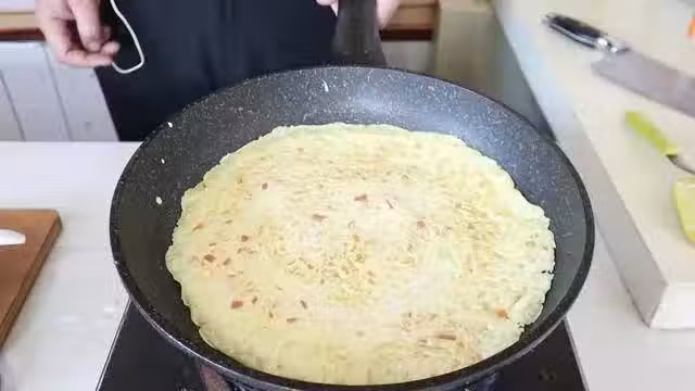 6.等著定型後,翻個面,一邊烙,一邊晃動鍋,直到兩面定型,餅皮表面微黃即可食用咯。