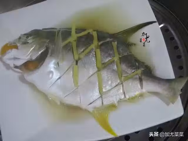 4、金鯧魚出鍋後,倒掉盤底的水,魚身放上薑絲,蔥絲,和辣椒絲,鍋里燒點熱油,澆淋在金鯧魚上面,最後再倒入幾點醬油即可上桌。
