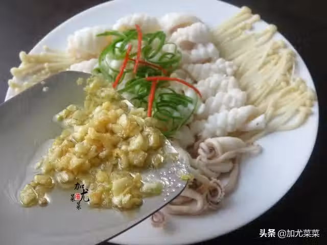 6、最後燒乾鍋里的水分,加入一勺花生油,油溫熱之後,倒入大蒜爆香,再加一點食鹽翻攪一下,趁熱倒在魷魚上面,接著再倒小半勺醬油澆淋一下,這道菜即可大功告成。