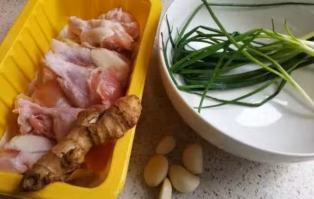 1.蔥打成結、姜切成片、蒜搗成蓉,鋪在一個大碗底下。