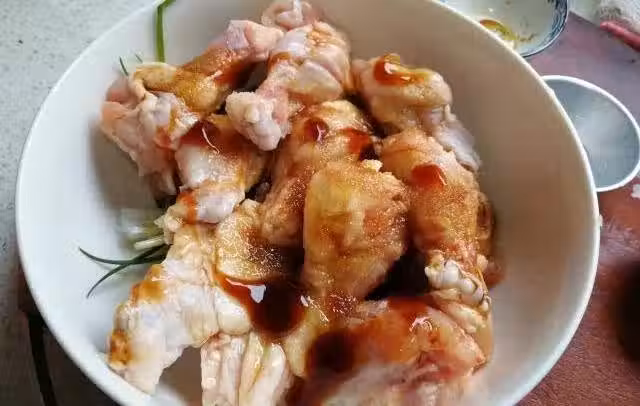 特別的一步來了,我臨時想起,腌雞翅應該放點料酒增香,正好,我家裡有腌好的楊梅酒,沒人喝,用它來代替料酒豈不是更好?於是,我取來楊梅酒,舀了兩小勺在雞翅根里。後面燜制過程中,那個香啊!簡直值了!你們也可以試試用白酒代替黃酒,要有楊梅酒什麼的就更好啦。