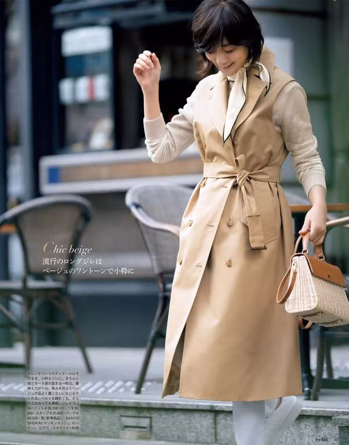 風衣的顏色自然是很多的,富岡佳子選擇的是軍綠色的類型,這種色系就會帶有一種率性的風格。還可以試著運用絲巾點綴在上衣的位置,從而帶來輕盈飄逸的姿態。