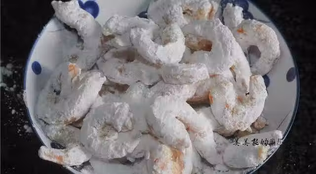 把蝦肉放在麵粉碗里均勻的裹上一層薄麵粉,然後將多餘的粉拍掉。
