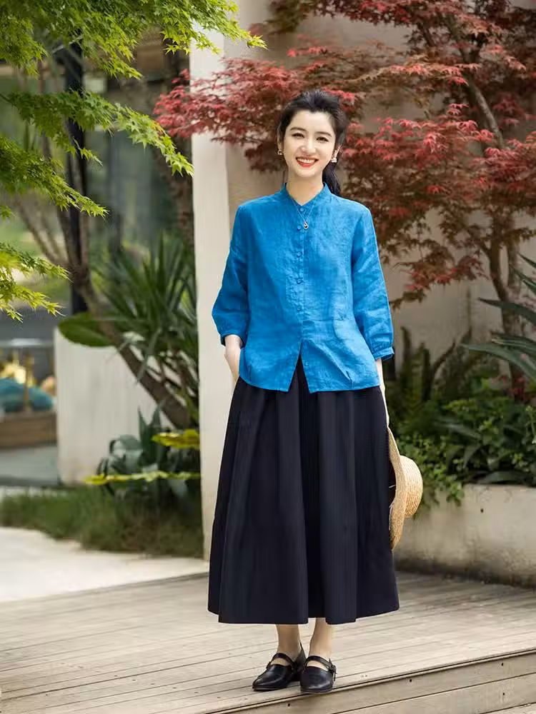 棉麻風的單品帶有傳統的中國風氛圍,搭配一些具有復古特性的單品既有個性,又可以呈現出濃濃的森系氣質。薄荷綠棉麻風上衣,搭配深藍色國風闊腿褲和米色皮革鞋子,呈現出的是如夏日的冰激凌一樣舒爽自然的大氣感。