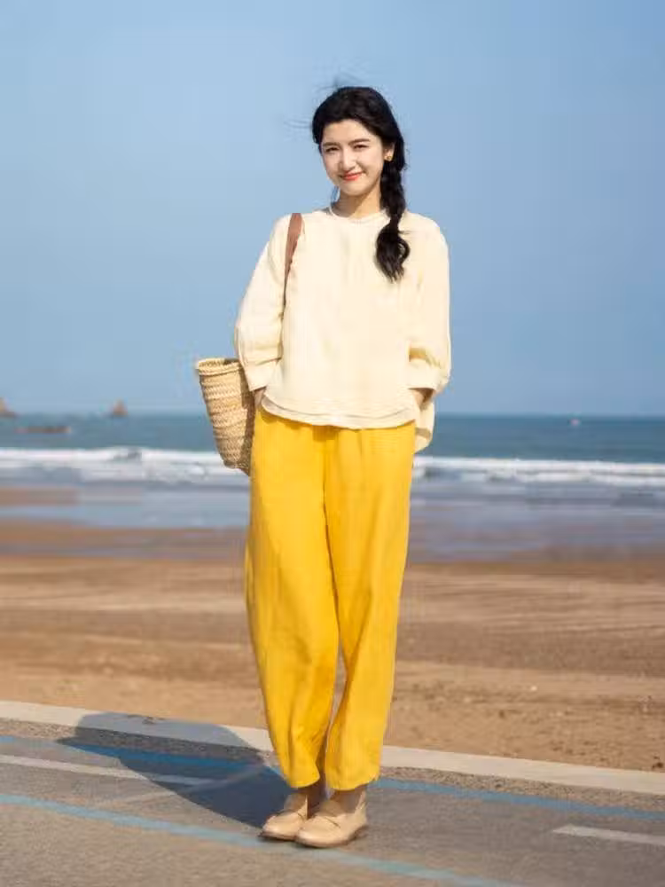 日常通勤中一件純色棉麻上衣+米色或白色休閑褲,就能夠給人以素凈、可靠、低調的的印象,姐妹們可以多多參考哦。