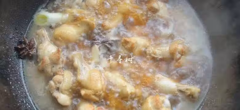 11. 加入熱水,基本沒過雞翅根就可以了,大火燒開後轉中小火,調入生抽、蚝油和老抽及少許白糖,並根據自己口味補充適量鹽調好紅燒味道,中小火燉上15分鐘。