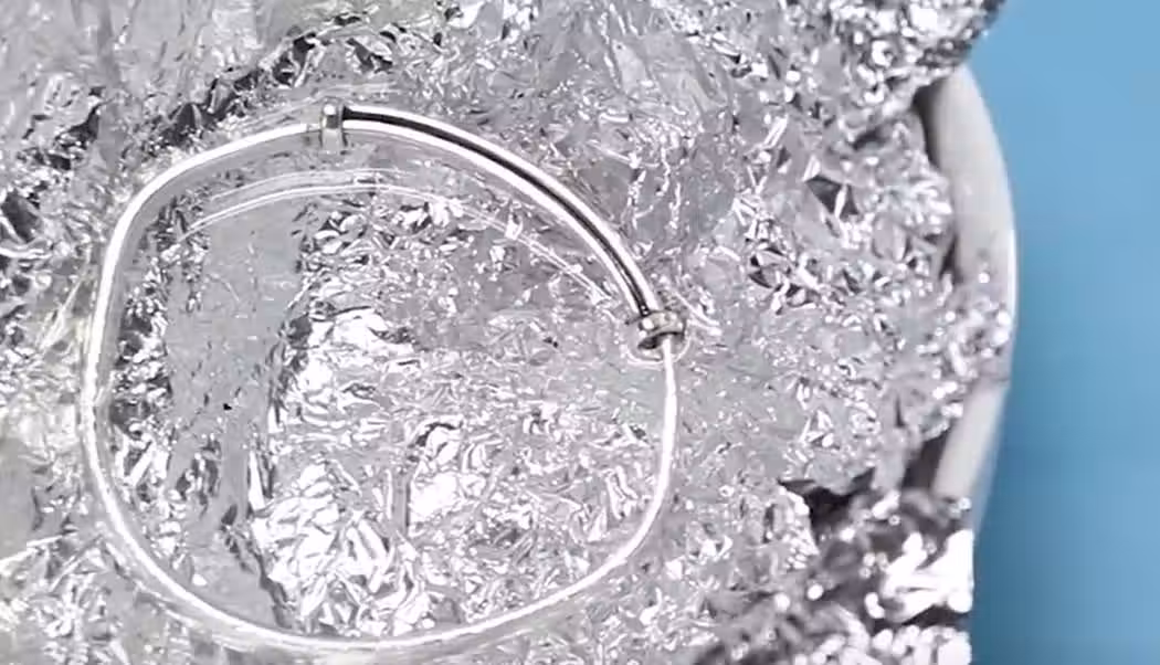 我們只需要準備一個錫紙和一個碗,將碗包裹成錫紙碗,錫紙碗包裹之後,我們將銀手鐲給它放入內部,然後倒上食鹽,注意食鹽要沒過這個銀首飾哦,我們現在倒入開水在這個錫紙碗裡面,為什麼要這樣做?