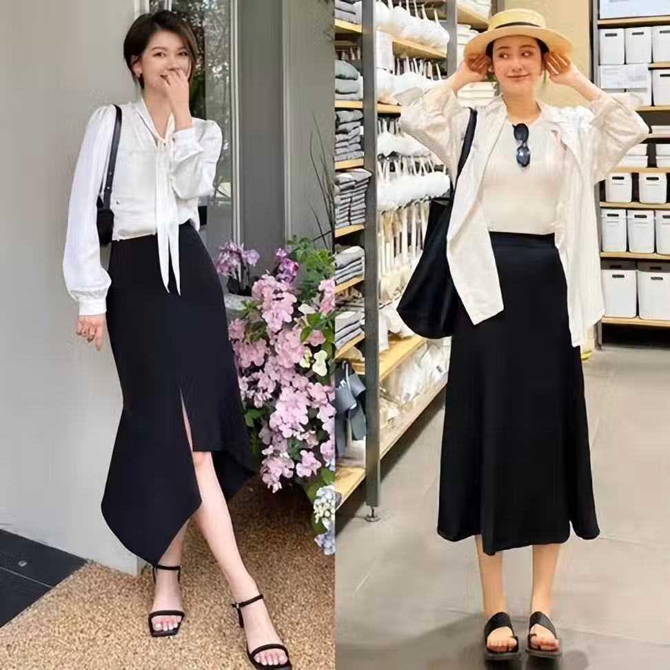 黑色半身裙搭配白色上衣,簡約的基礎色組合起來,層次感很強,高級感毋庸置疑。